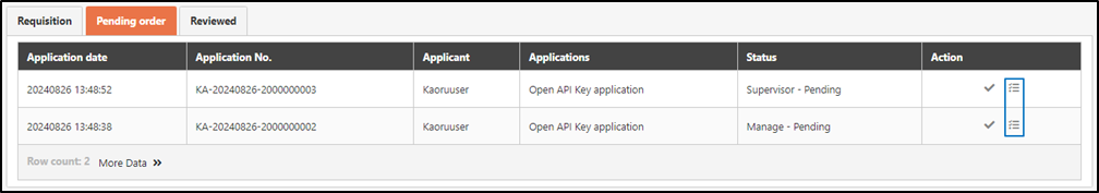 If the approval user's role in the Approval Flow Settings includes Level 2, after the user clicks the icon under the Pending order tab, the status of the application will be Supervisor - agree under the Reviewed tab.