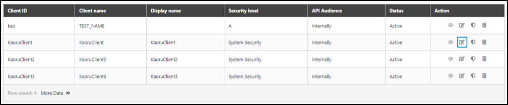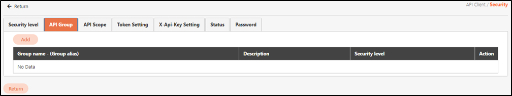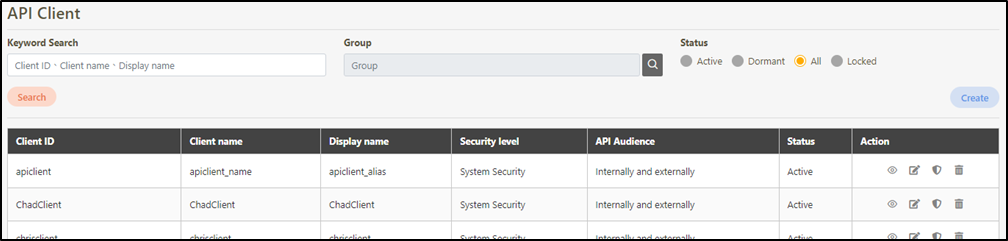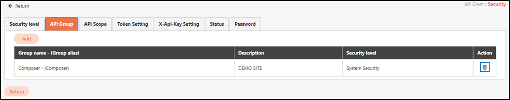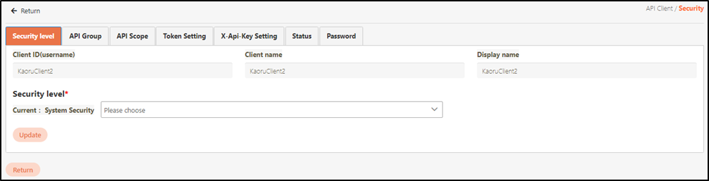Client security configurations include: Security level, API Group, API Scope, Token Setting, X-Api-Key Setting, Status, and Password.
