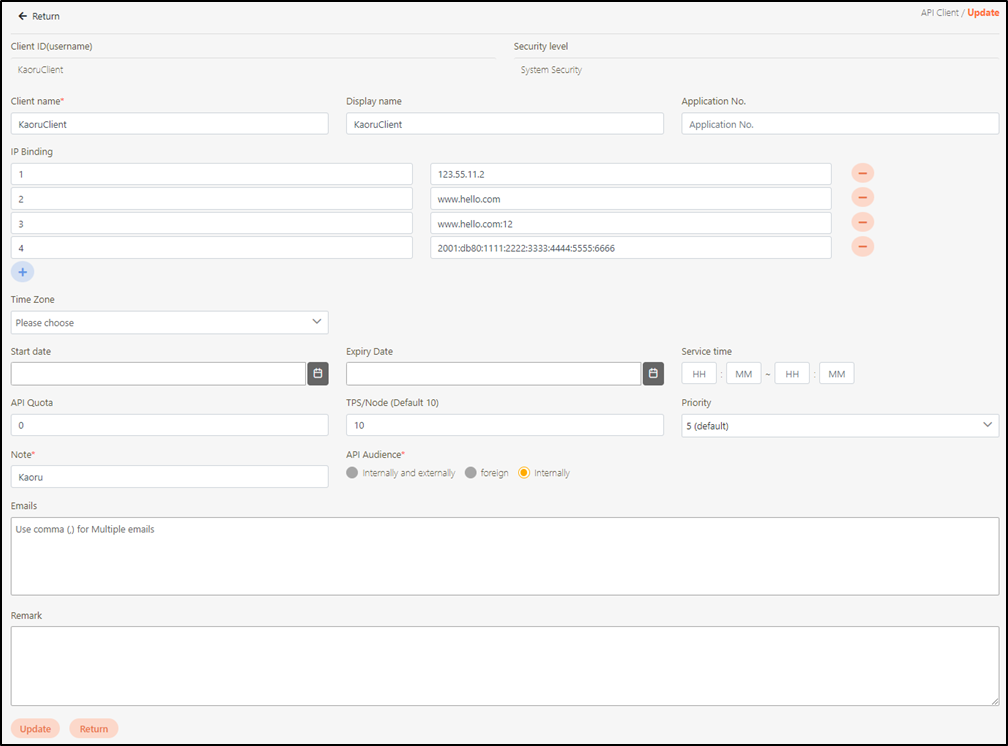 Client accounts are usually used by API users; when your partners need to use your API, a client needs to be created here for your partner to browse the API portal, apply for API authorization and perform other actions with this account.