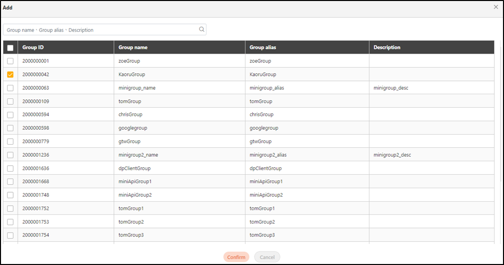 In the Authority group* field, click Add to access the list page and select the authorization group for the X-Api-Key, and click Confirm to save and exit.