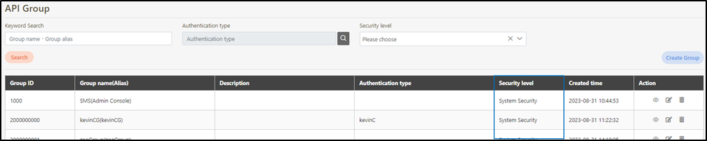 If c is selected as the security level for the client here, security levels A and B cannot be found in API Group.