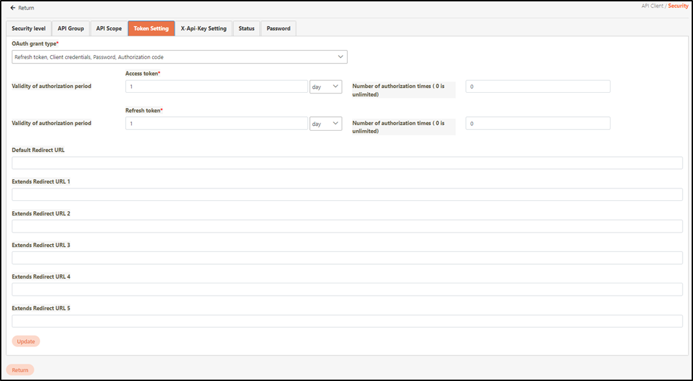 Take the figure below for example. If the Validity of authorization period is set as 1 day for both the Access token and Refresh token, and the Number of authorization times are set as 3 times, it means that both the Access token and Refresh token can only be accessed 3 times within 1 day; it will become invalid if the number of times or number of days is exceeded.