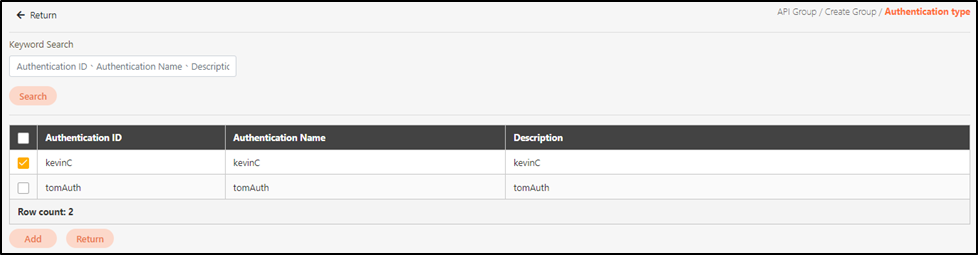 Authentication type: Authentication type is required for the APIs in this group; multiple choices allowed.