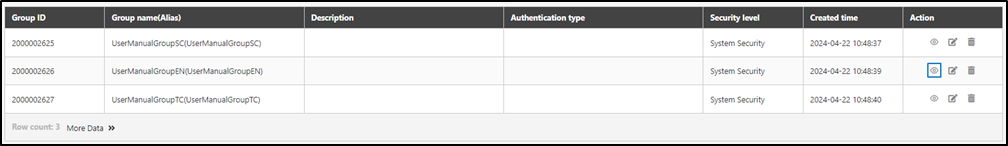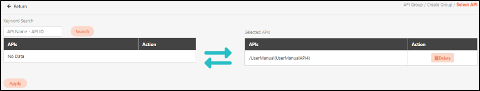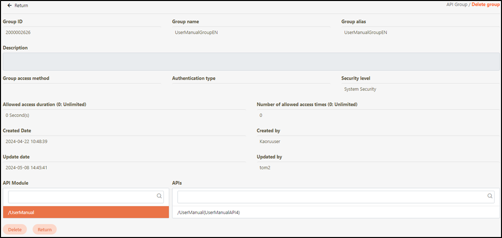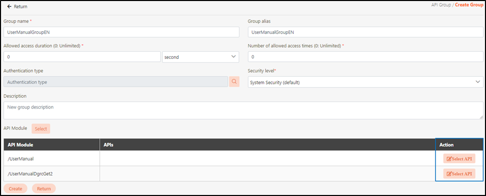 If the group is created with no API added to the module, this module will not be added to the group. Take the figure below for example. APIs are added to /UserManual, and no API is added to /UserManualDgrcGet2. Upon clicking Create, only /UserManual will be saved to the group and not /UserManualDgrcGet2.