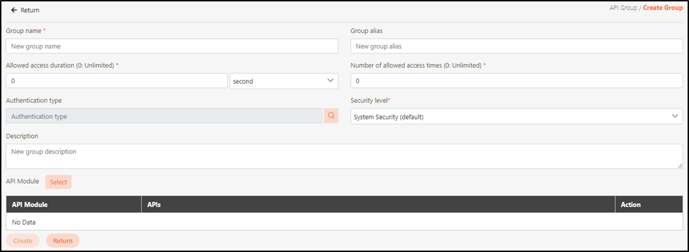 Number of allowed access times (0: Unlimited)*: The maximum number of times this group of APIs can be authorized; it can no longer be used after the number of times has exceeded. Set to 0 for unlimited duration.