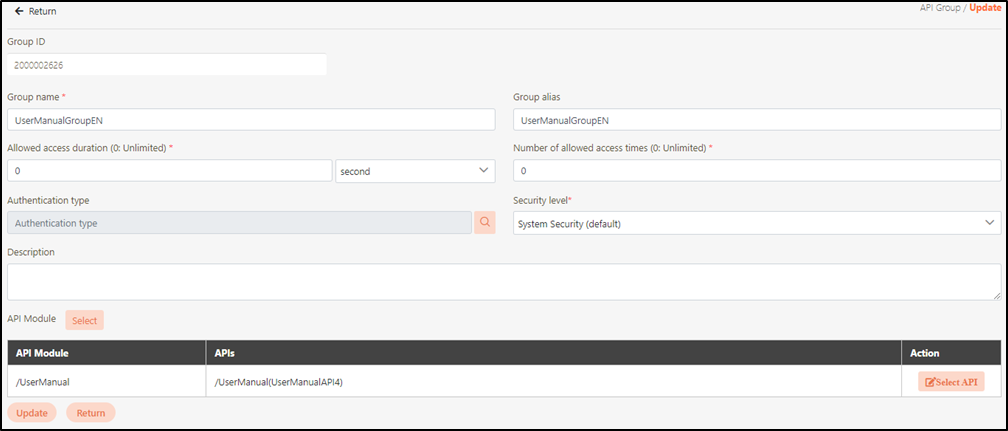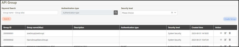 API Group is for creating and maintaining API groups. APIs with the same authentication type can be placed in the same group here; APIs in this group will correspond to authorizable client permissions according to the security levels originally set; when selecting the API Scope, a group is used as the unit and authorized at once. This function is usually used to authorize API clients.