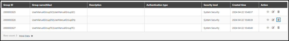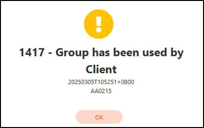 If this group is set as available to a client in API Client > Security > API Group, the error “1417 - Group has been used by Client” will appear, meaning that this group is in use and cannot be deleted.
