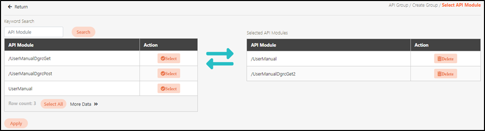 API Module: Click Select to enter and select the API module currently mounted on the digiRunner platform.