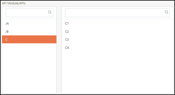 Take the figure below for example. The Module list has three groups /A, /B and C, in which group C contains the four APIs C1, C2, C3 and C4. If users need to use them, all four APIs in the group will be authorized for them at once.