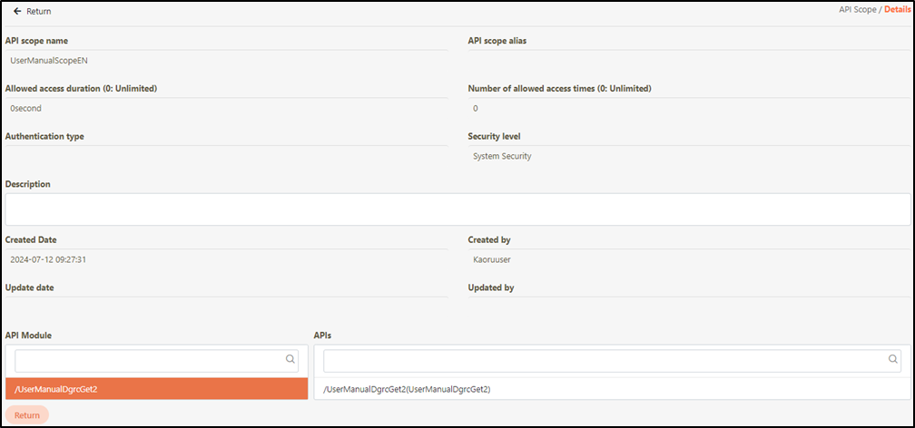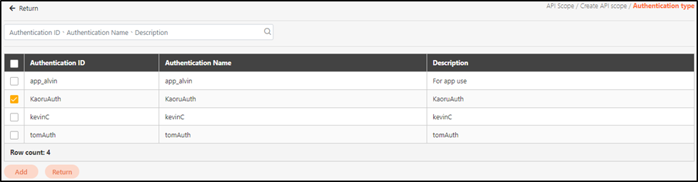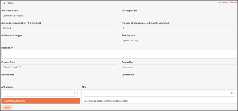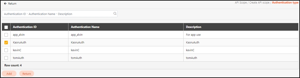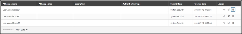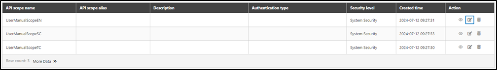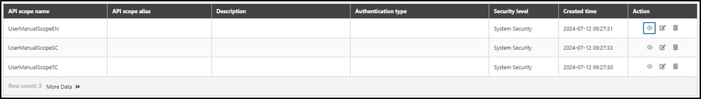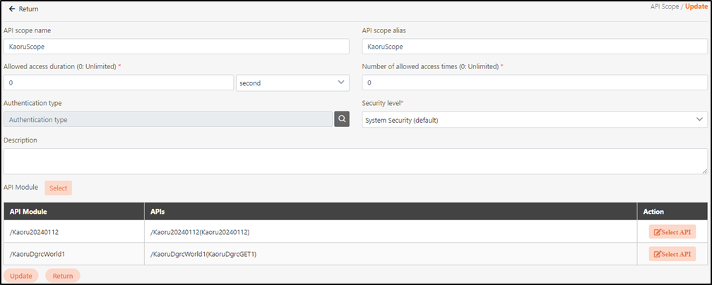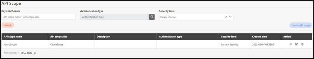 APIs with the same authentication type can be placed under the same scope here, and the APIs in this scope will correspond to authorizable client permissions according to the security level set.