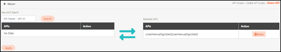 The API Scope function is for outsourced vendors to use to apply for API functions from our bank in place of users. For example, when a user wants to query his/her demand deposit balance at TPIsoftware Bank through the authentication network, the authentication network will redirect the user to the application authorization page of TPIsoftware Bank, where TPIsoftware Bank will verify the personal information of the user, then ask the user to select the information he/she wishes to view, and authorize it.