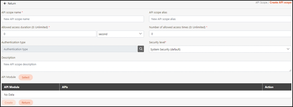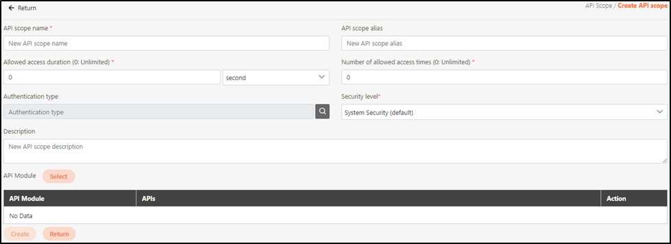 Number of allowed access times (0: Unlimited)*: The maximum number of times this scope of APIs can be authorized; it can no longer be used after the number of times has exceeded. Set to 0 for unlimited duration.