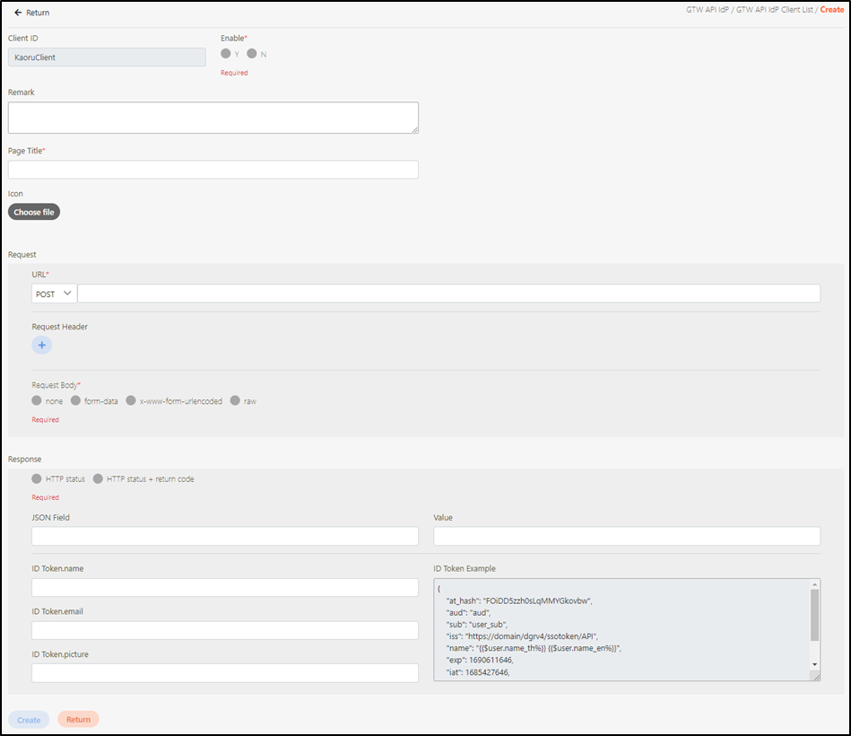Click Create to access the API IdP Client creation page.