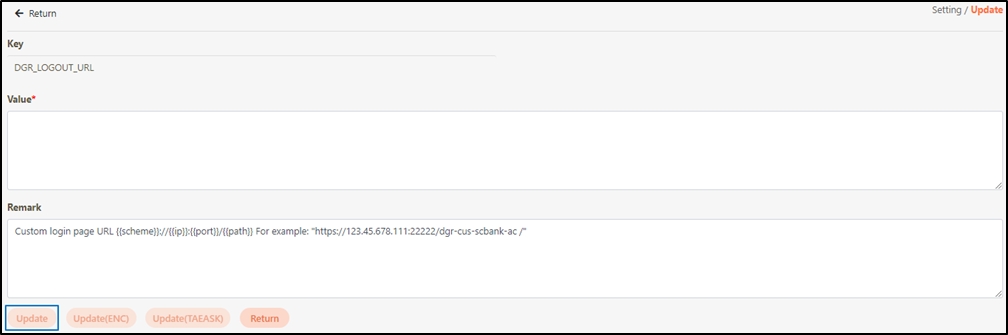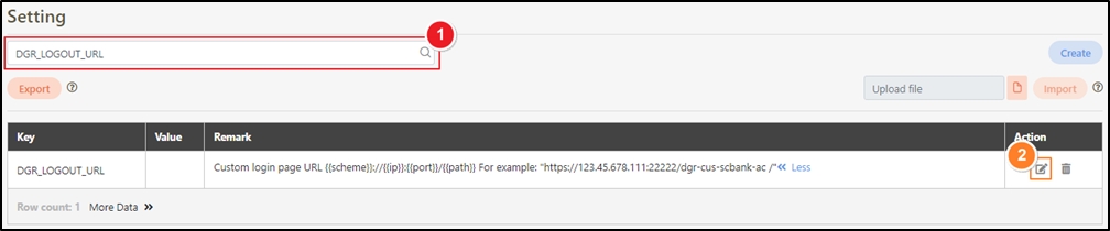 On the System Configs > Setting page, enter DGR_LOGOUT_URL in Keyword Search (as shown in ➊ below), and click on the