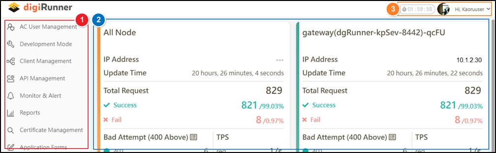 Upon successful login, the left side of the page displays the system's function menu (as shown in ➊ below), while the right side shows the system status (as shown in ➋ below). Click on the user name in the upper right corner to display Profile, About and Log out (as shown in ➌ below).