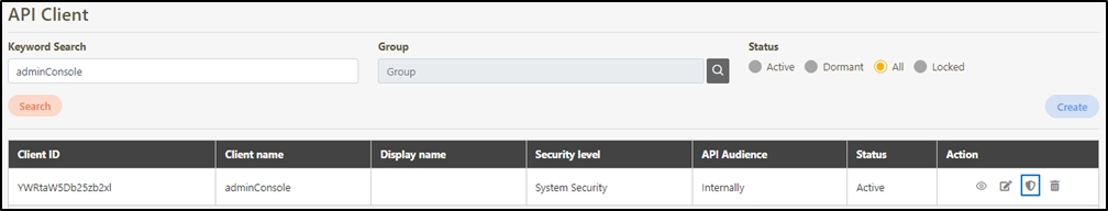 To modify the logout time, go to Client Management > API Client and search for the user adminConsole, and click on the icon to access the Security page.