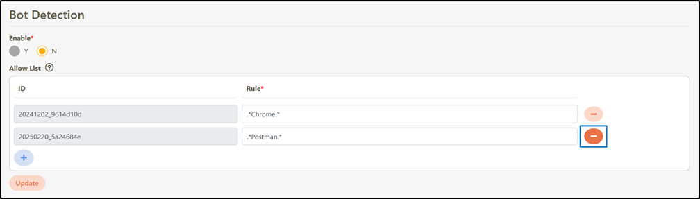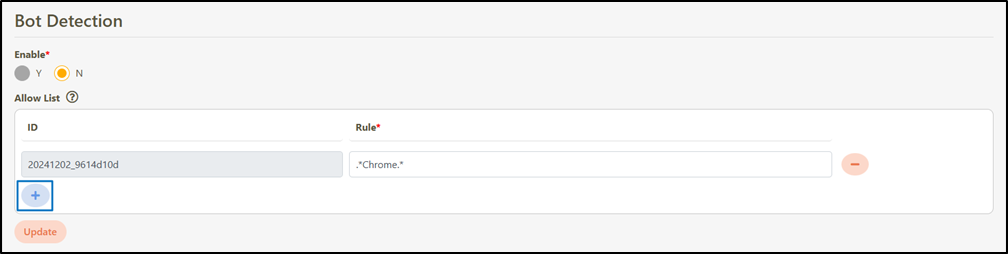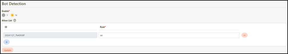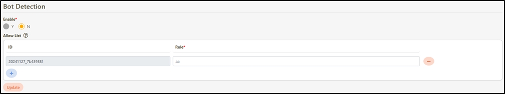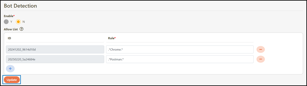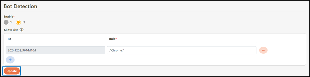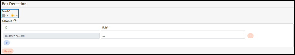 To enable or disable Bot Detection, check Y or N, and click Update to apply the changes.