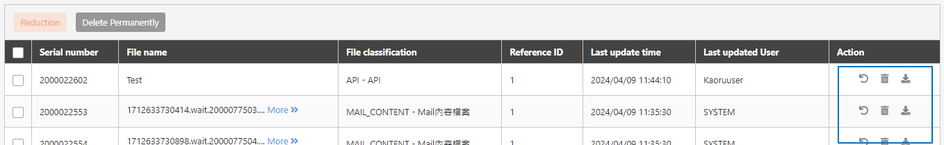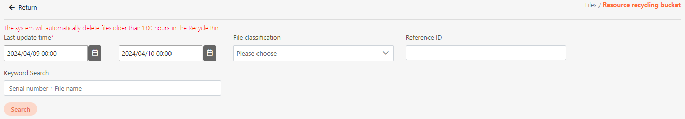 If files were deleted by accident, they can be recovered from the recycle bin. The system will delete the files that are in the recycle bin for more than 1 hour automatically.