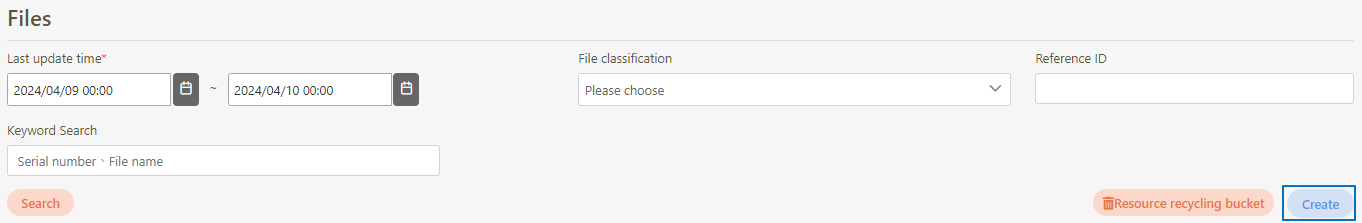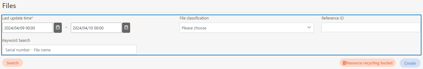 Keywords, start and end dates, file category or reference ID can be entered to search files.