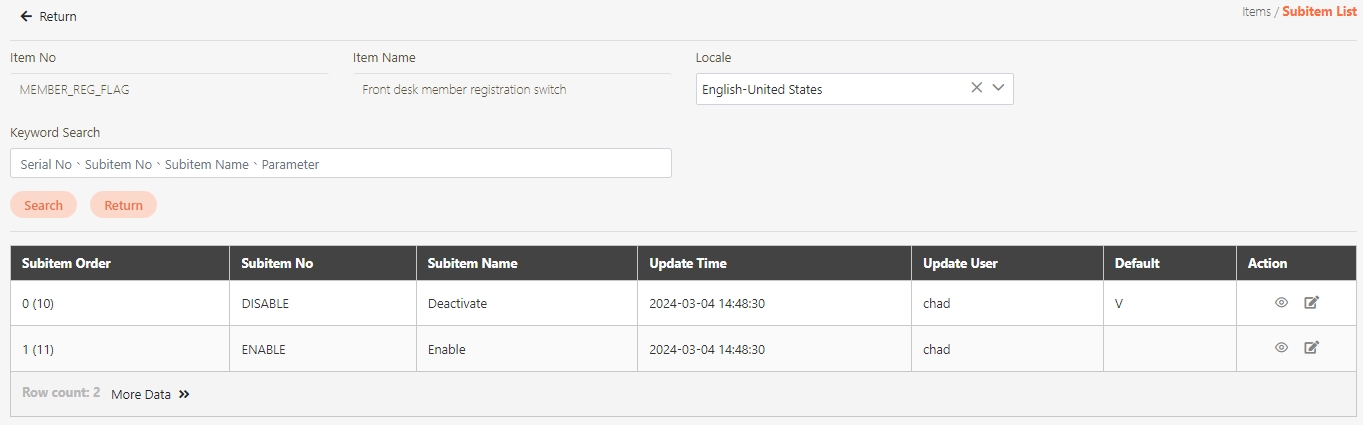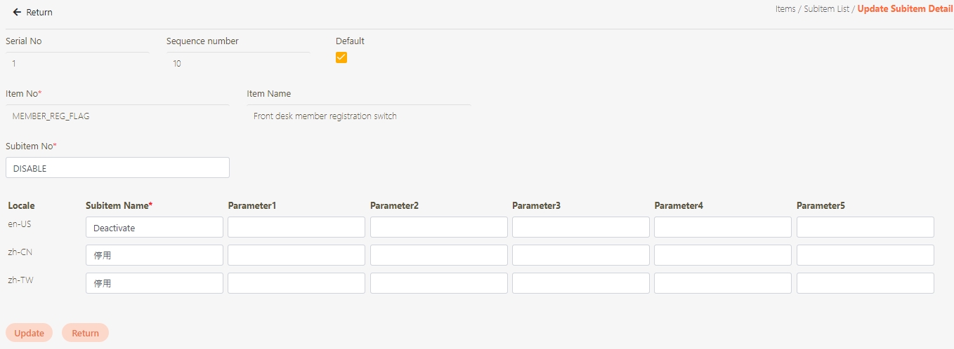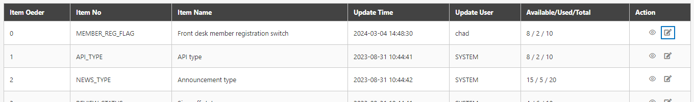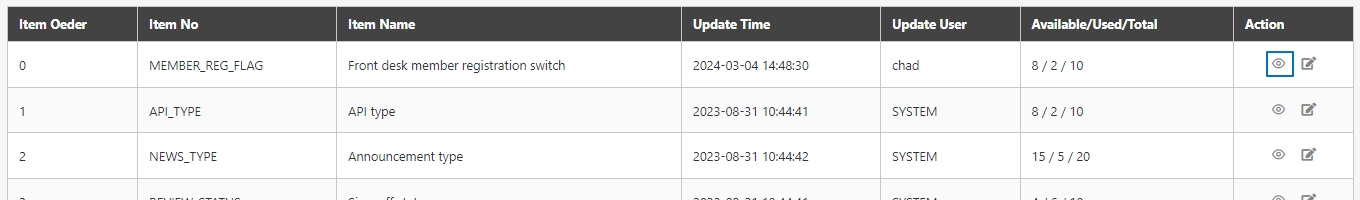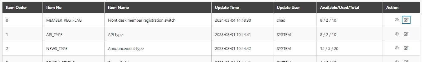 Most items are necessary settings required for system operation; if users change them randomly, it may result in system errors, such as: Setting MEMBER_REG_FLAG is a display item in the drop-down menu used to set the member registration switch at the front stage; this function is similar to the registry in Windows. Do not change them by yourself without the instruction of TPIsoftware personnel.