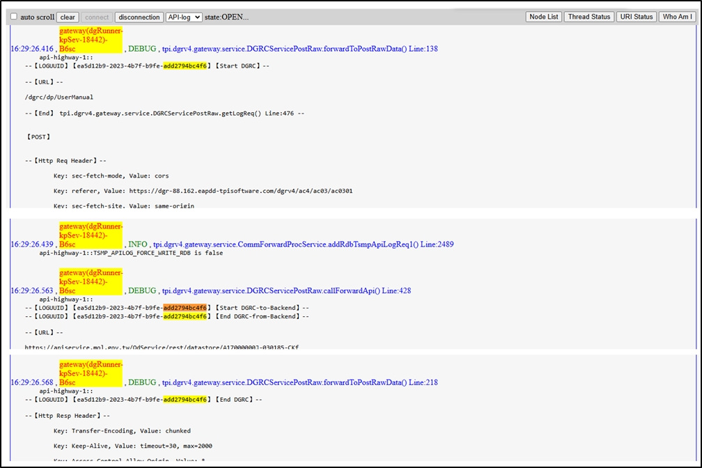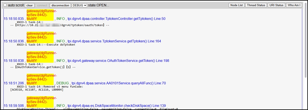 This feature page is primarily used for real-time monitoring of the system's operational status. By configuring different log levels, users can view detailed activity logs and API call information for