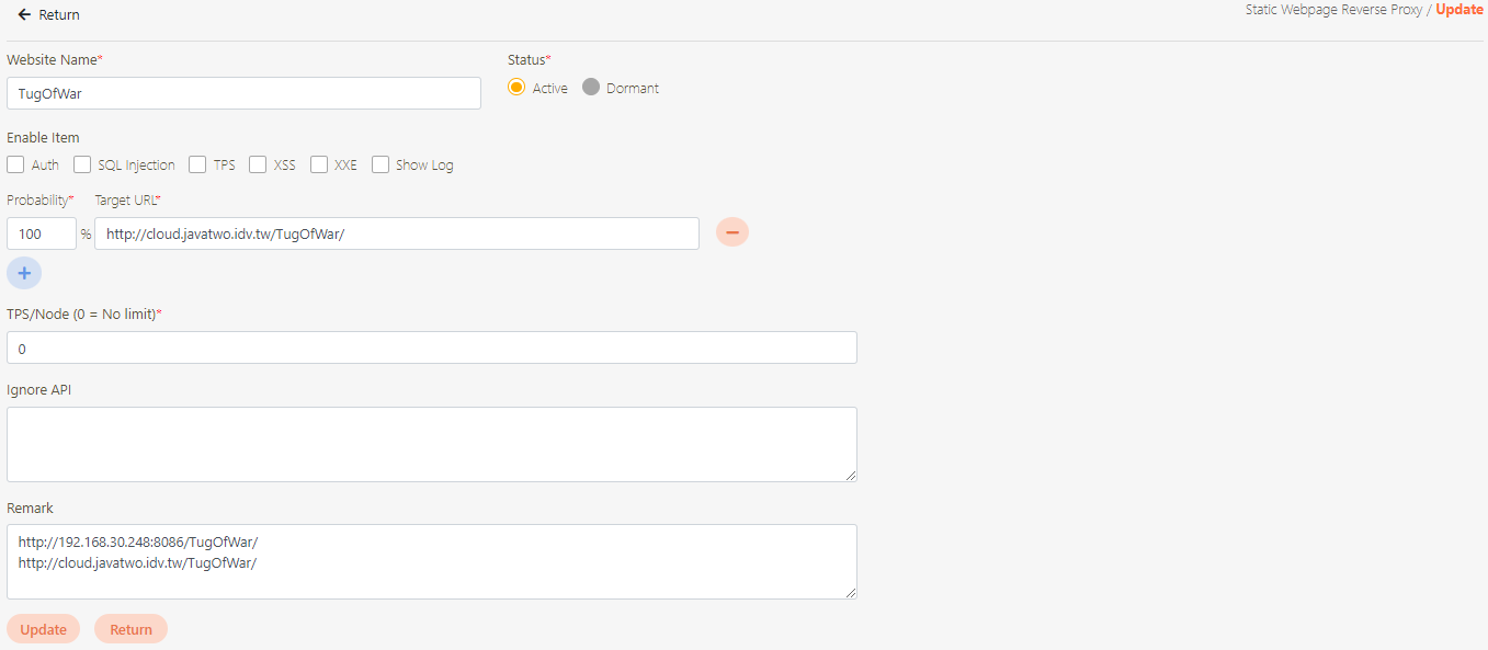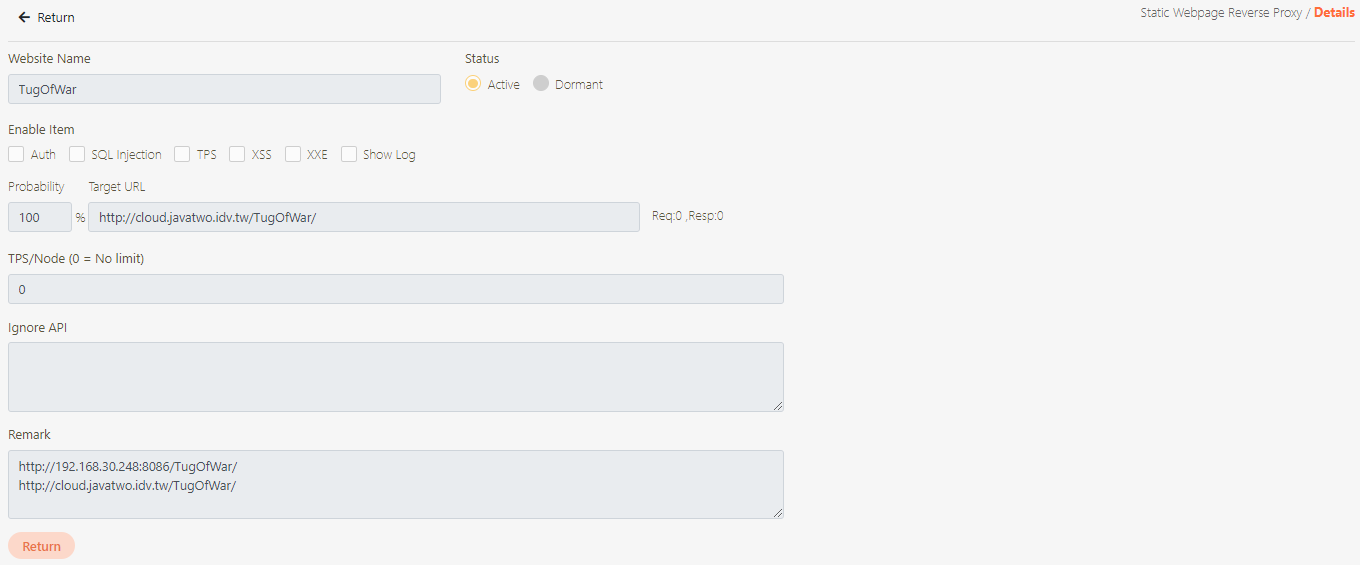 Status*: Enable and disable the static web page reverse agent.