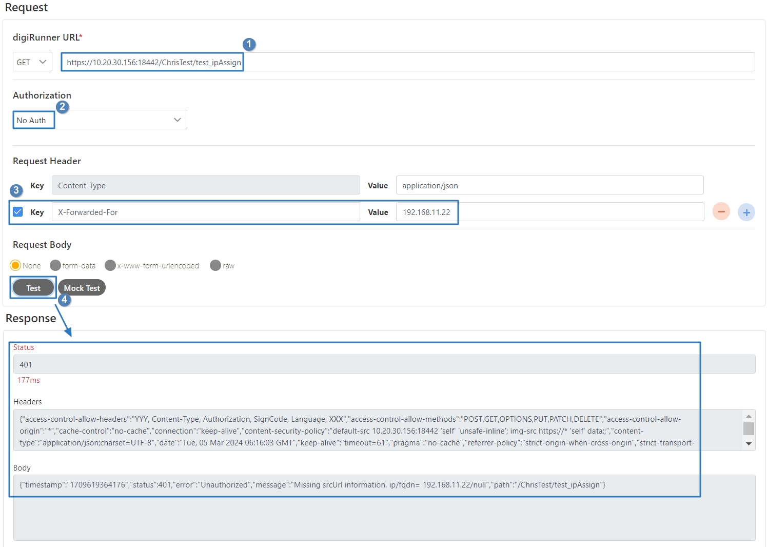 Click Test to view the response. Since the IP is not defined in the Source IP, it is expected that the call will fail, the return code received will be 401, and the Body will respond "