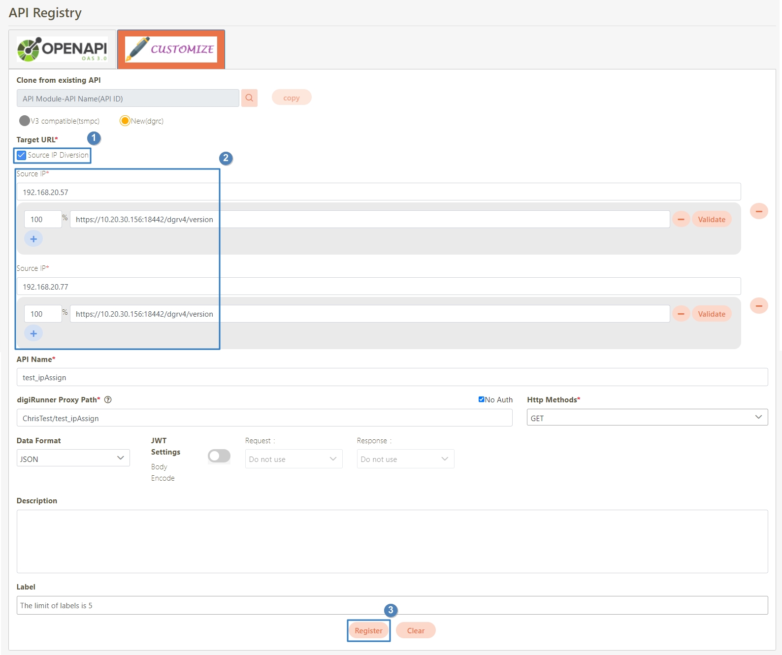 Fill in the Custom IP for the first Source IP, and fill in the API address to call for the target URL.