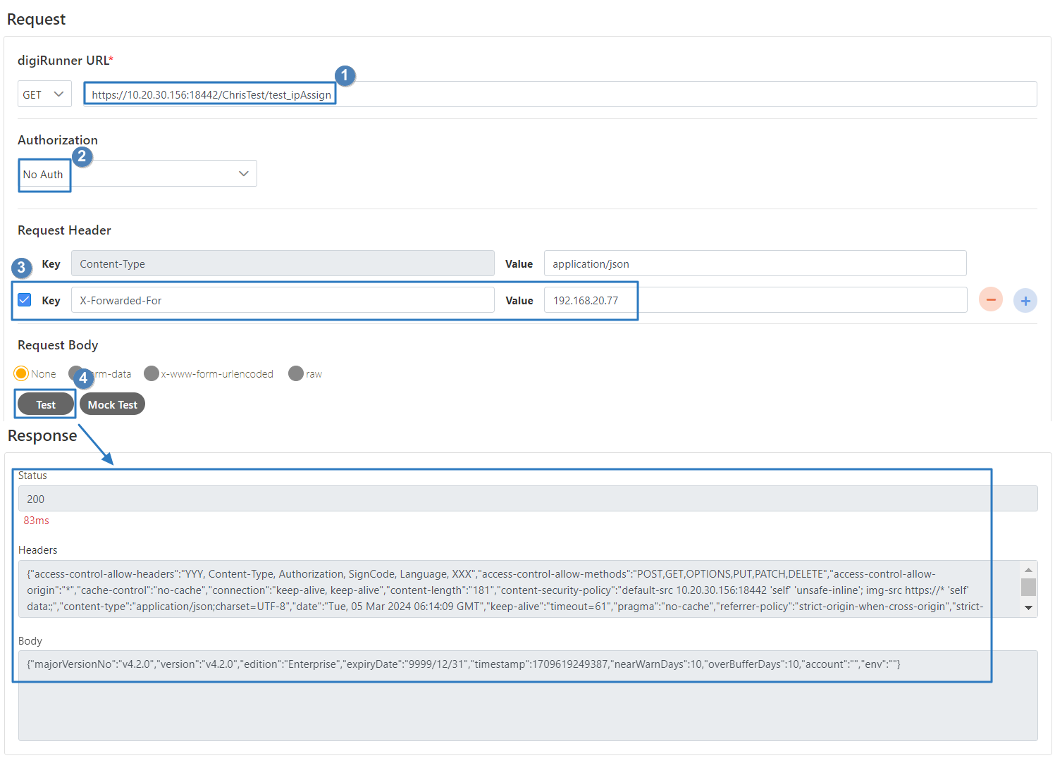 Click Test to view the response. Since the custom IP is defined in the Source IP, it is expected that the return code will be received successfully and be 200, and the Body contains the data defined by the API.