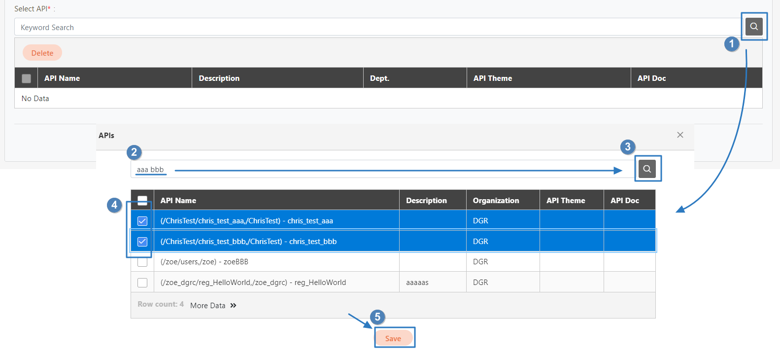 Enter the keyword to search in the Select API field, and select the API to apply.