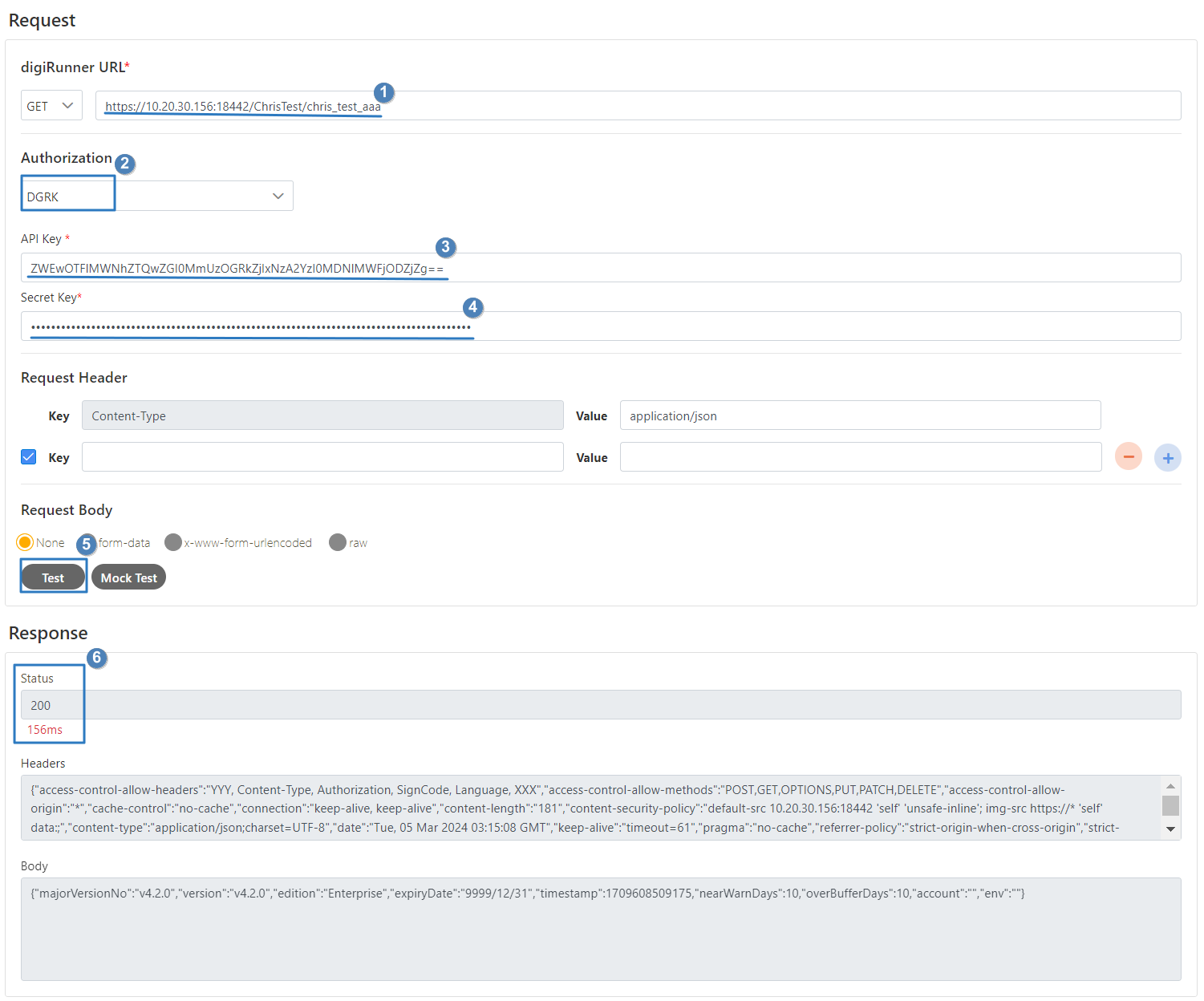 Click Test to view the response. In this example, the status code is 200, indicating that the body contains the data defined by the API.