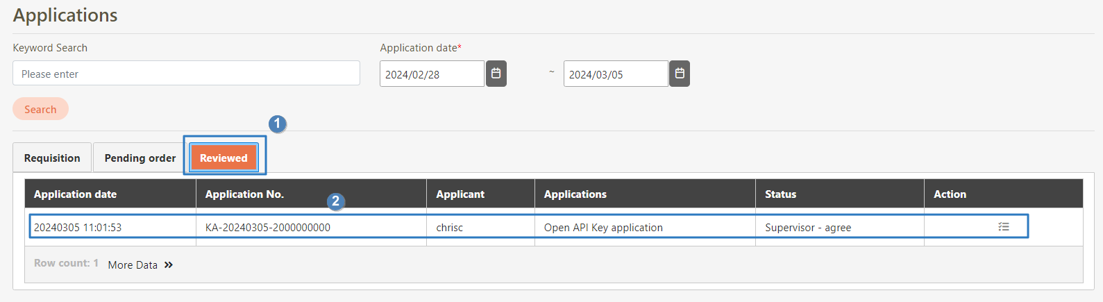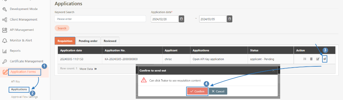 Go to Application Forms > Applications, locate the API Key application form to sign-off in the list of application forms.