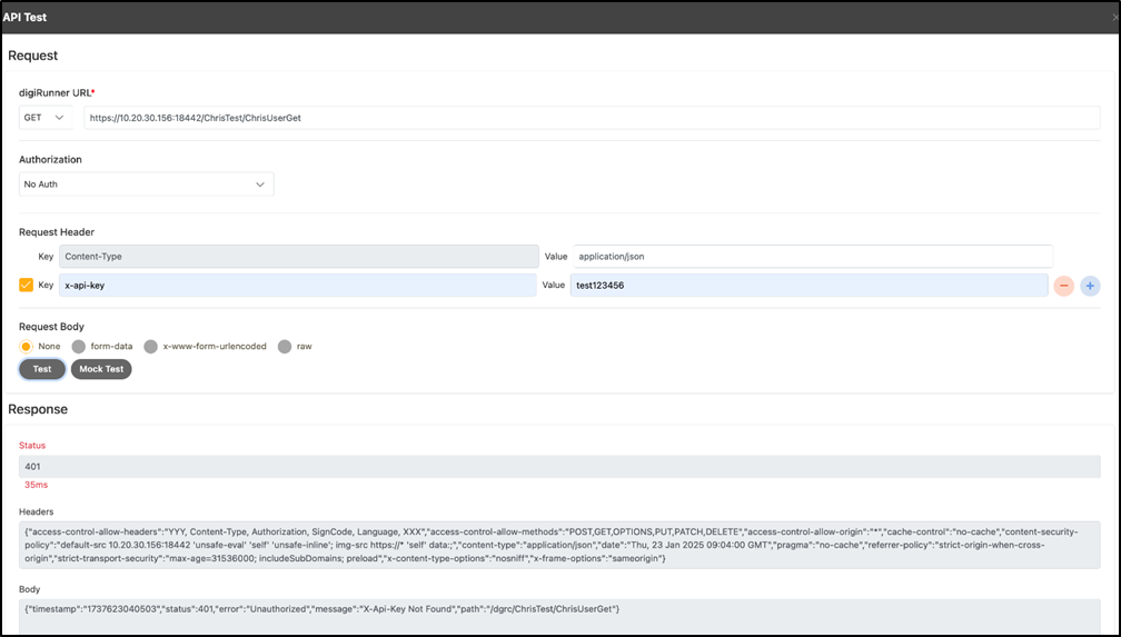 If the Status shows 401 as shown below, the request has failed due to an authorization error. The response Body will contain an error message indicating authorization failure. In this case, verify the accuracy of the X-API-Key.