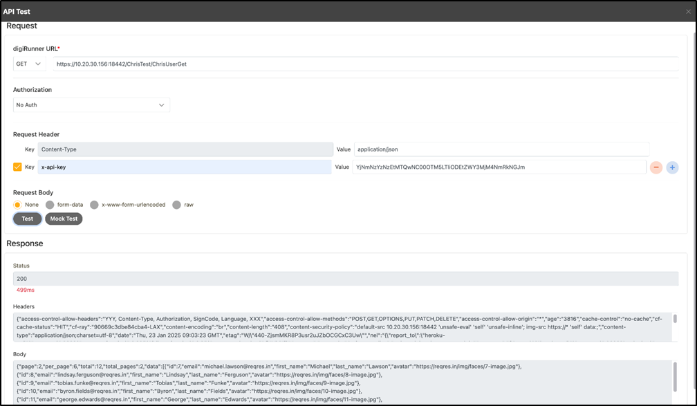 Click Test to call the API, and review the results in the Response field.