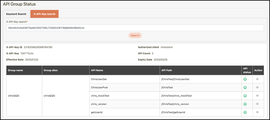 If the entered key exists in digiRunner, you will be able to view the related API information on the page, including its effective date, expiration date, total number of authorized APIs, and the client information to which the key belongs.
