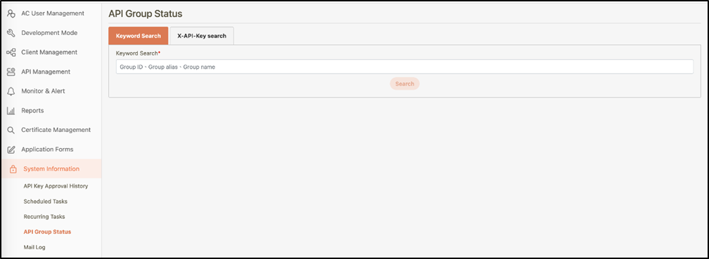 Log in to the digiRunner Admin Console, and go to System Information > API Group Status to access the page.