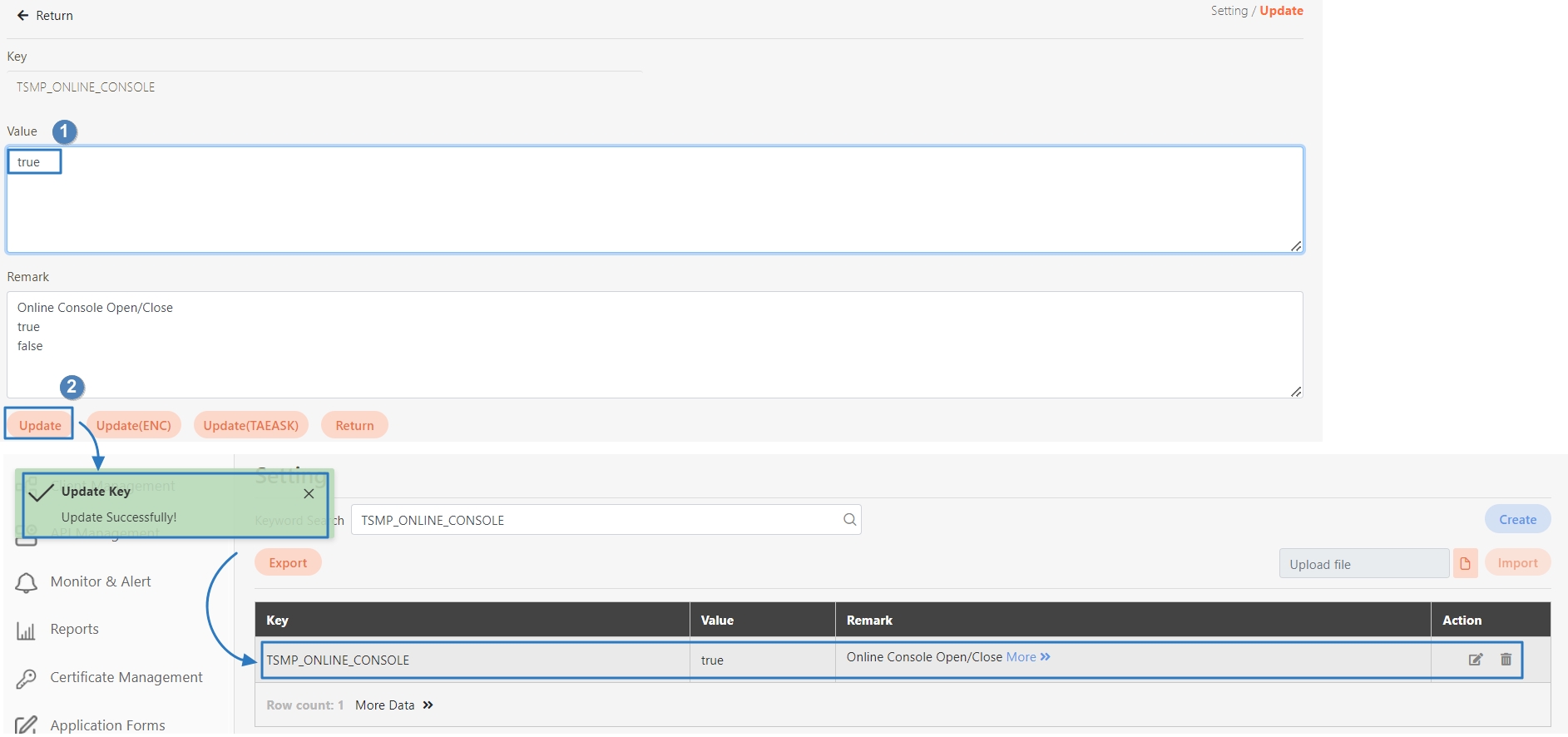 Enter TSMP_ONLINE_CONSOLE in the keyword field to search. If the returned value is false, click on the