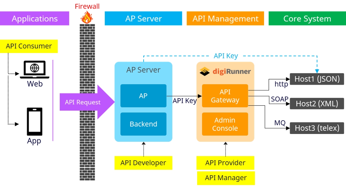 Server to Server: As a router, digiRunner manages API key-based communication between servers and core systems, supporting multiple protocols for interoperability.