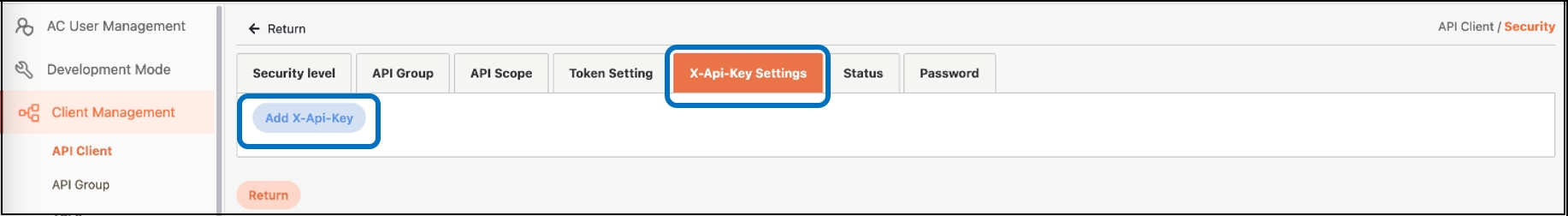 Select the X-API-Key Settings tab, and click Add X-Api-Key to access the creation page.