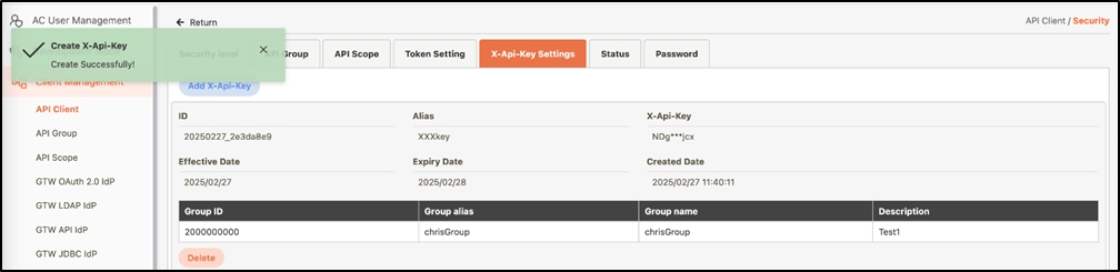 Click Add X-API-Key to complete the creation, and review the displayed information to confirm the key has been successfully created.