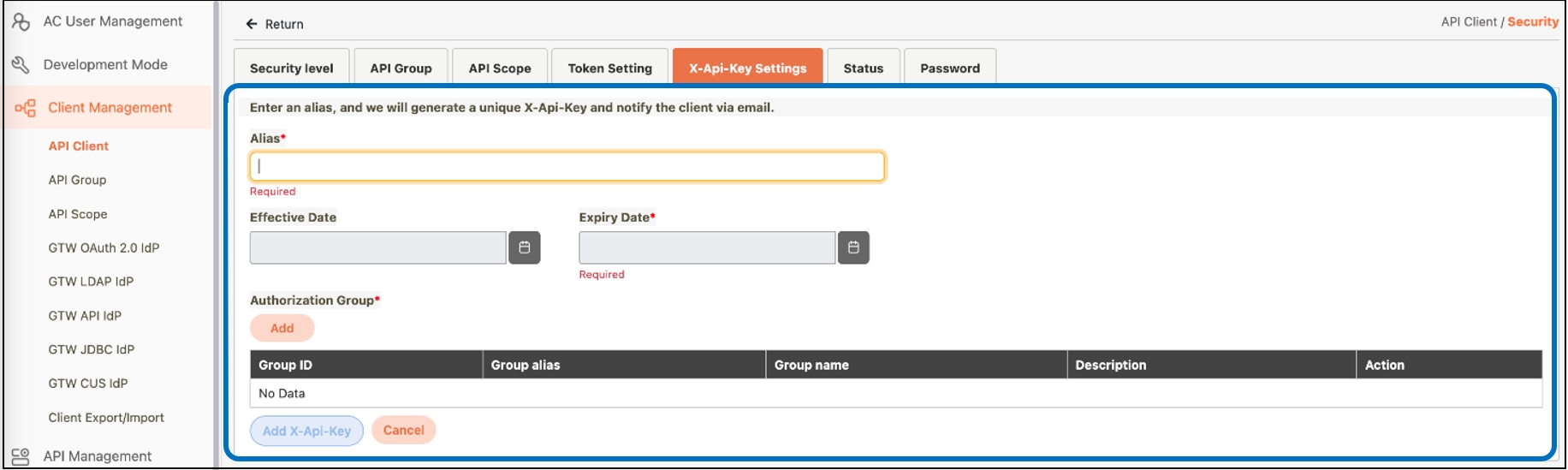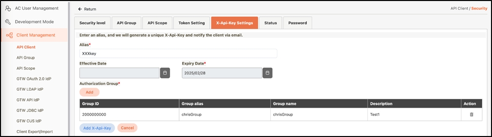 Authorization Group*: Click Add to access the list page, select the authorization group for the X-Api-Key, and click Confirm to save and exit.
