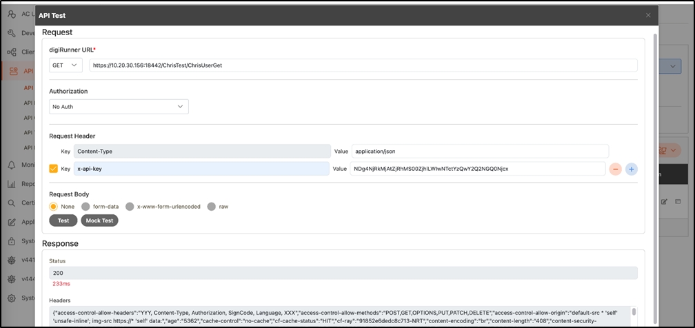 Click Test to call the API and verify that the X-API-Key successfully authorizes access to the API.