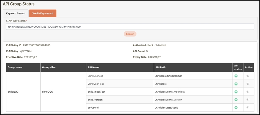 After obtaining an X-API-Key via email, if you are unsure about the authorization scope (which APIs it corresponds to), you can utilize the API Group Status feature provided by digiRunner to quickly retrieve the relevant API information associated with the X-API-Key.