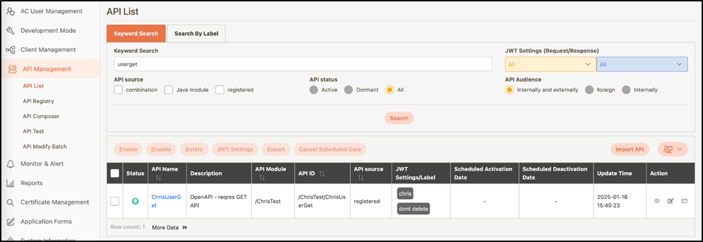 Use the Keyword Search filters to locate the API associated with the X-API-Key authorization obtained in the previous step.